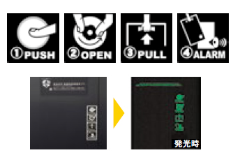 暗闇の中でも視認でき、安全に救援物資を取り出すことが可能です。表記はピクトグラムにより、言語に制約されず、備蓄ボックスの使用方法を伝えます。